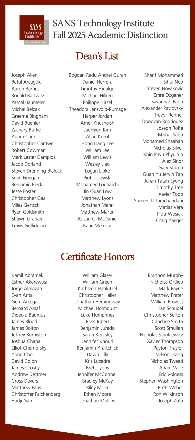 The SANS Technology Institute recognizes and honors students who demonstrate exceptional academic performance and leadership potential in cybersecurity.